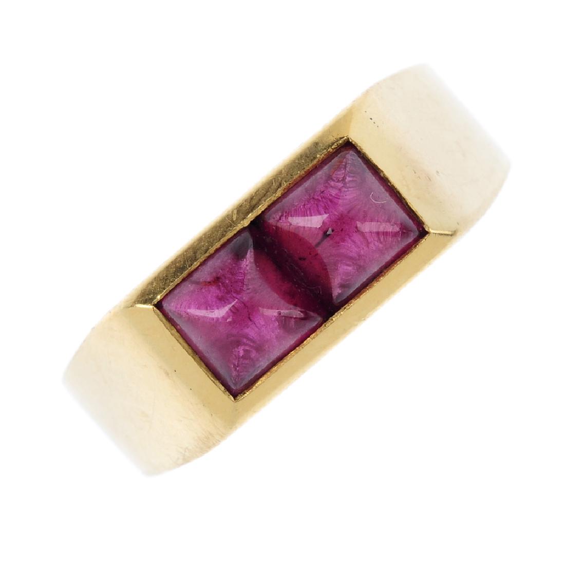 A gentleman's 18ct gold garnet two-stone ring. Designed