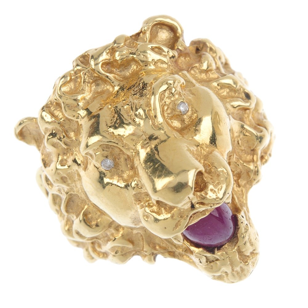 A gentleman's ruby and diamond lion head ring. The