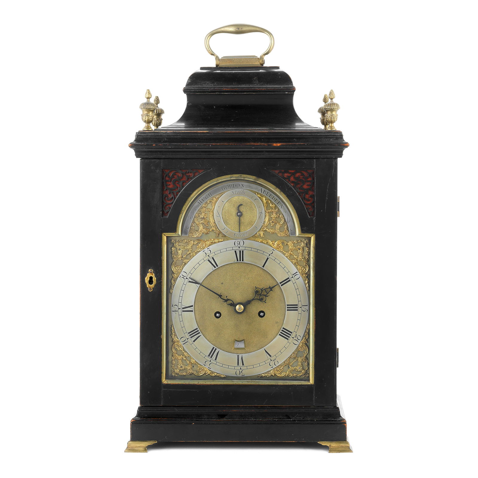 A GEORGE III EBONISED AND BRASS MOUNTED BRACKET CLOCK