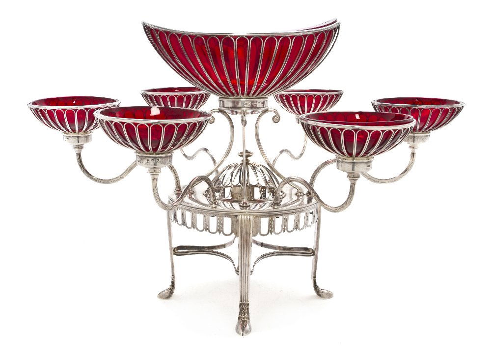 A George III Silver and Ruby Glass Epergne, Matthew