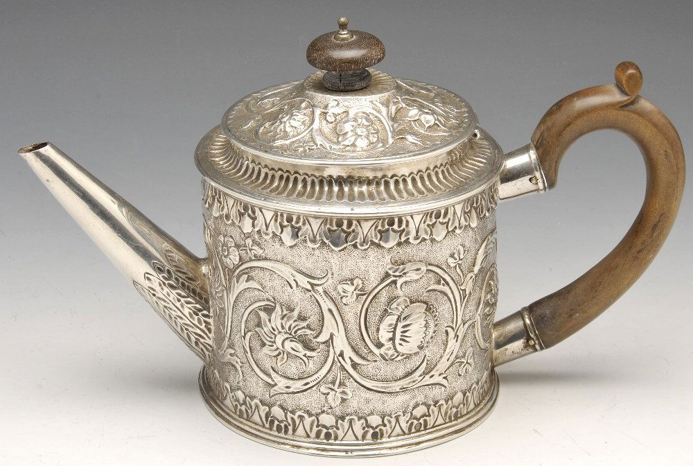 A GEORGE III SILVER CIRCULAR BACHELORS TEAPOTFeb 17, 2026A George III Sterling Silver Teapot, Robert Jones II, London, 1796Feb 15, 2026A GEORGE IV SILVER TEAPOTFeb 17, 2026Richly decorated silver teapot, Louis WOLFERS, with pear-shaped, fluted body and applied floralFeb 15, 2026Y A GEORGE III SILVER LOBED OBLONG BALUSTER TEA POTFeb 17, 2026A GEORGE III DRUM SHAPED TEAPOTFeb 17, 2026Silver coffee pot with a pear-shaped, twisted body, resting on three graceful feet. It features aFeb 15, 2026Pure Silver Teapot1 day LeftY A WILLIAM IV SILVER LOBED BALUSTER COFFEE POTFeb 17, 2026A GEORGE III SILVER COFFEE POTFeb 17, 2026A GEORGE III SILVER KETTLE ON STANDFeb 17, 2026Vintage Silver-Plated Teapot with Ornate Handle and SpoutFeb 12, 2026A George III silver Argyl Aaron Lestourgeon, London 1781Silver coffee pot with a pear-shaped, twisted body, resting on three graceful feet. It features aFeb 15, 2026George III Silver Coffee Pot, Mark of Richard Gurney & Thomas CookFeb 12, 2026A GEORGE III SILVER OVAL TEAPOTFeb 17, 2026