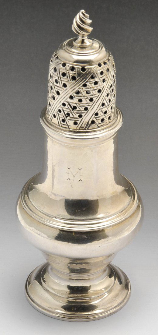 A graduated set of three early George II sterling silver casters, London 1727 by George Wickes (reg.A graduated set of three early George II sterling silver casters, London 1727 by George Wickes (reg. 3 Feb 1722) Comprising a sugar caster, a pepper caster, and a mustard ‘blind’ caster. E