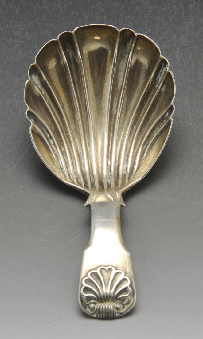 A George IV silver caddy spoon, plus a jam spoon and