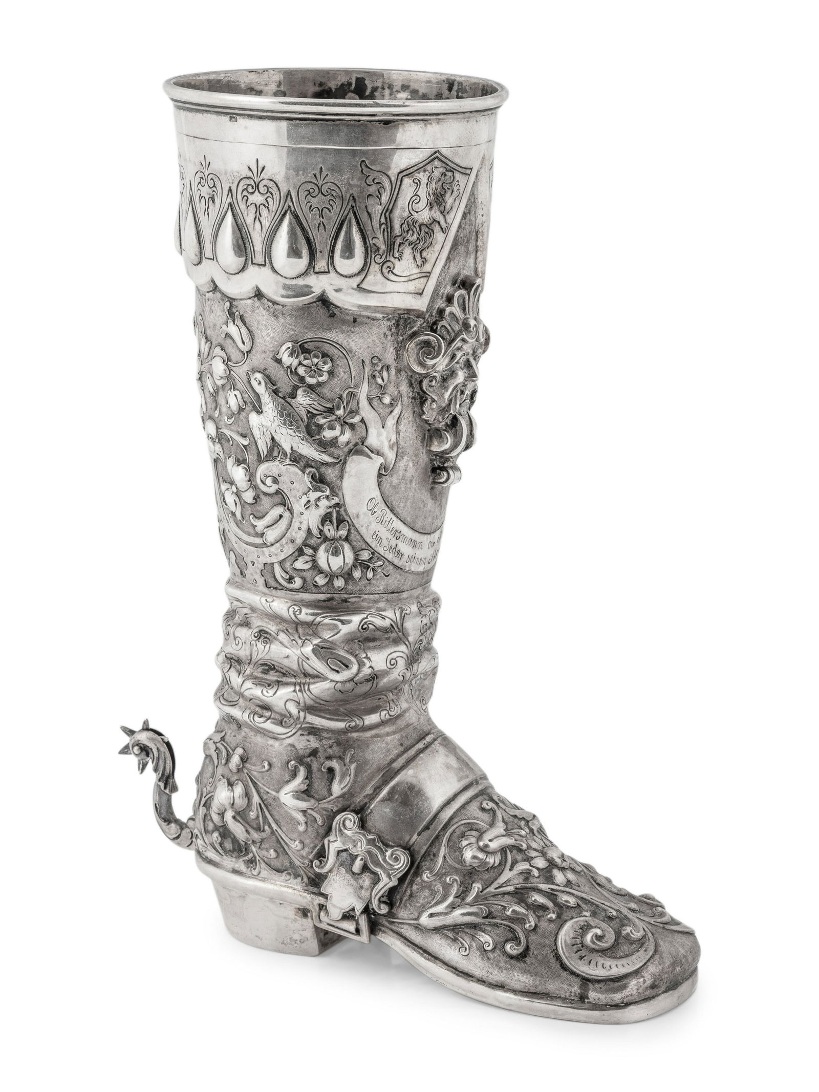 A German Hanau Silver Boot having extensive repousse