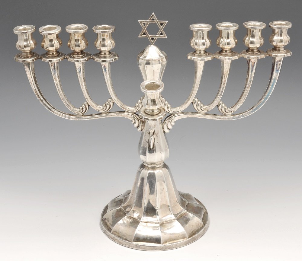 SoldAntique Judaica .800 Silver Hanukkiah (HanukkahAntique Judaica .800 Silver Hanukkiah (Hanukkah Menorah)with early 20th century German hallmarks, in the Rococo Revival style with rosebud and scroll motif, domed base supports a baluster form standarSee Sold Price