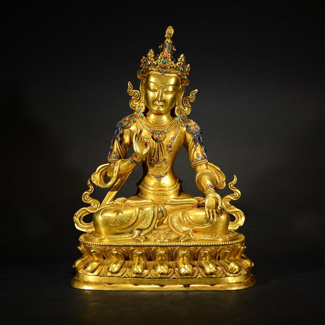 SoldFine Gilt Bronze Buddha Figure Ming Yongle Mark大明永乐年制款 鎏金无量寿佛铜像 A finely cast gilt bronze figure of the bodhisattva Maitreya; seated in vajrapSee Sold Price