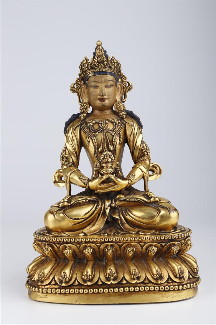 A GILT COPPER AMITAYUS BUDDHA STATUE, MING DYN.