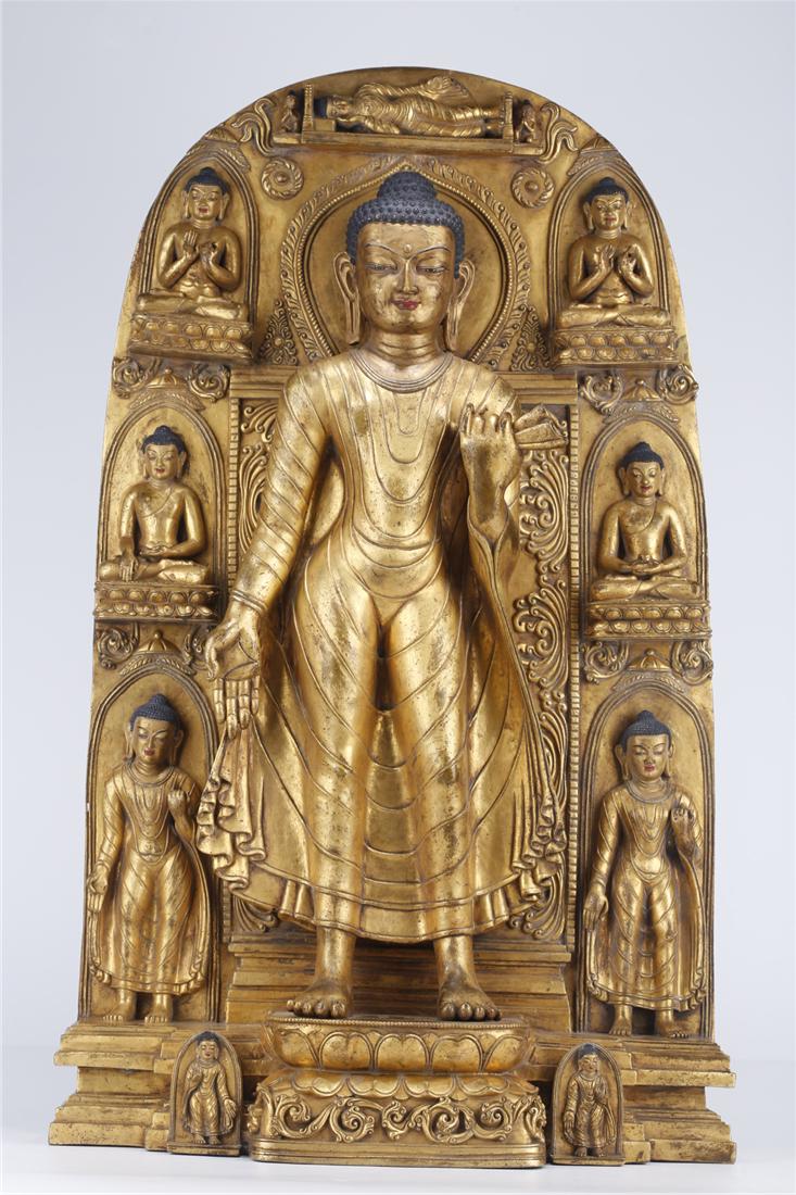 A GILT COPPER STANDING SAKYAMUNI BUDDHA STATUE.