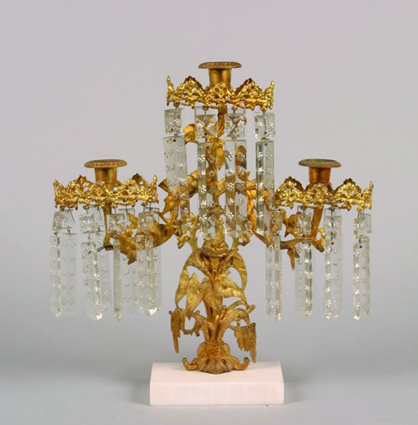 Sold(3) FIGURAL GILT METAL & MARBLE GIRANDOLE SET(set of 3) Figural gilt metal and marble girandole garniture set, (1) three-light candelabra and (2) single light candelabra, each having branches hung with star and floral cut prisms over a gilt metaSee Sold Price