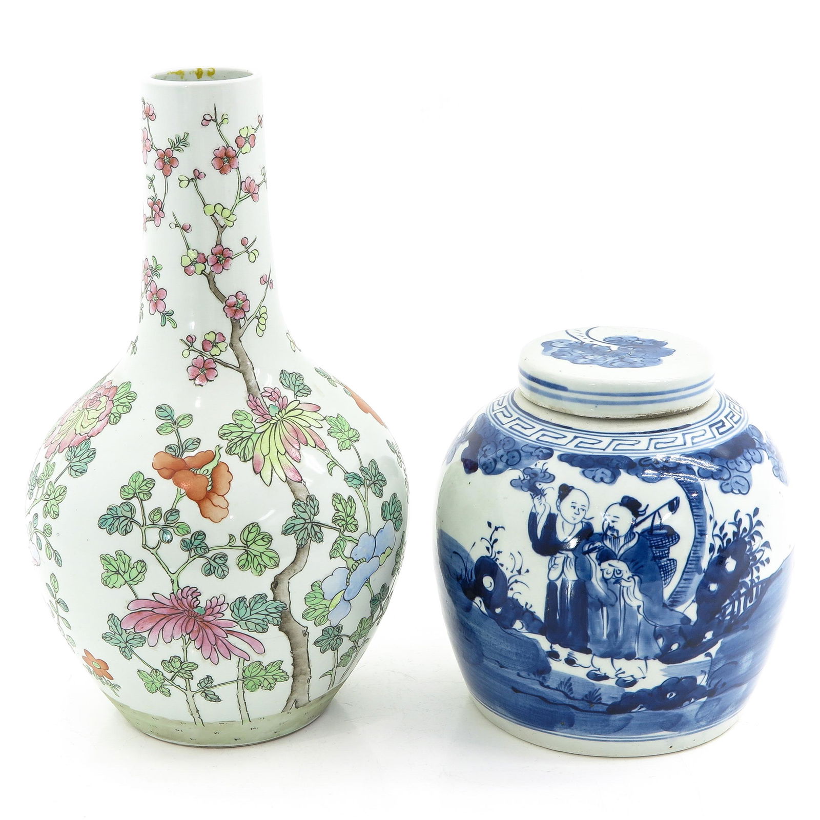 SoldA Chinese Export Bottle Vase.A Chinese Export Bottle Vase. Together with a Chinese export ginger jar (height: 8.5") Height: 13.25"See Sold Price