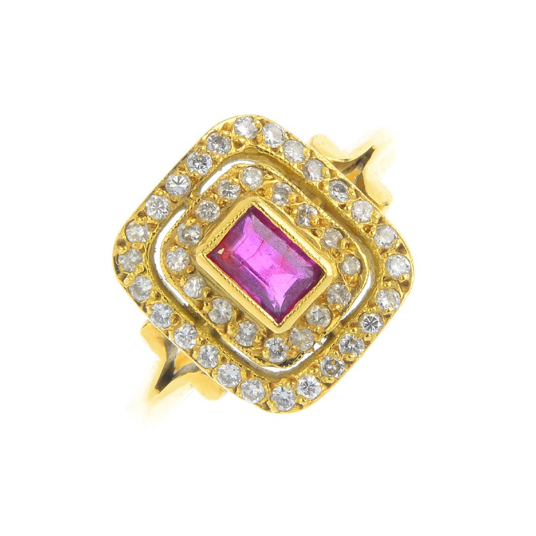 A gold ruby and diamond cluster ring. The