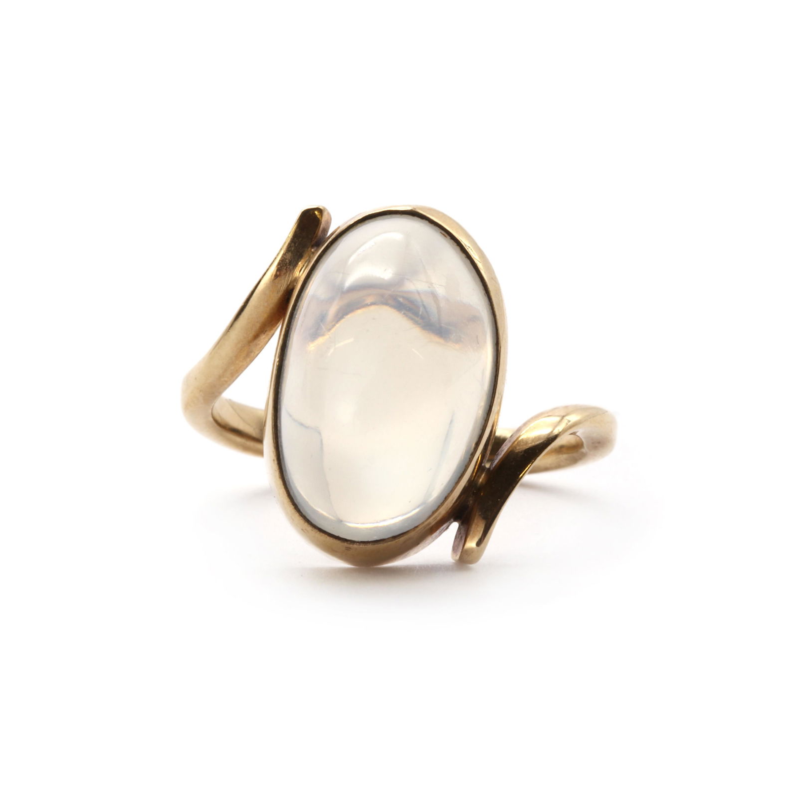 SoldAn Edwardian single stone moonstone ring,An Edwardian single stone moonstone ring, with a circular cabochon moonstone, rub set in a plain collet to a shallow court section shank, marked 18CT, tested as approximately 18ct gold, 2.16g. Ring siSee Sold Price