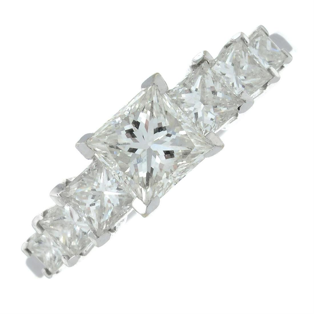 A graduated square-shape diamond seven-stone ring.