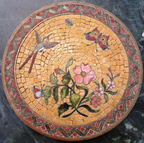 SoldFine 19th c Micro Mosaic Top Side Tableround top comprised of eight micro mosaic medallions depicting various Roman sites with a central mosaic of birds and a specimen border, supported by a carved and polychrome rosewood base. 28" h x 17See Sold Price