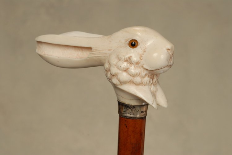 SoldFigural Rabbit CaneWooden cane with figural rabbit handle. Carved head, glass eyes. 36"H, rabbit head 5"L. Scratches to cane and rabbit's ears.See Sold Price