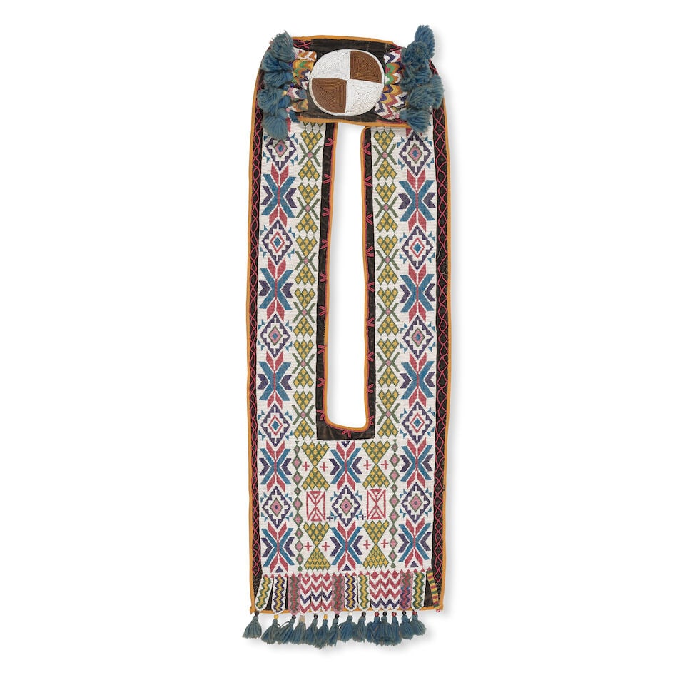 SoldA Great Lakes beaded cloth bandolier bag lg. 36 in.A Great Lakes beaded cloth bandolier bag Fourth quarter 19th century, cloth backed, beaded with stylized leaves and geometric devices on a white ground, lower panel with multicolored geometric designsSee Sold Price