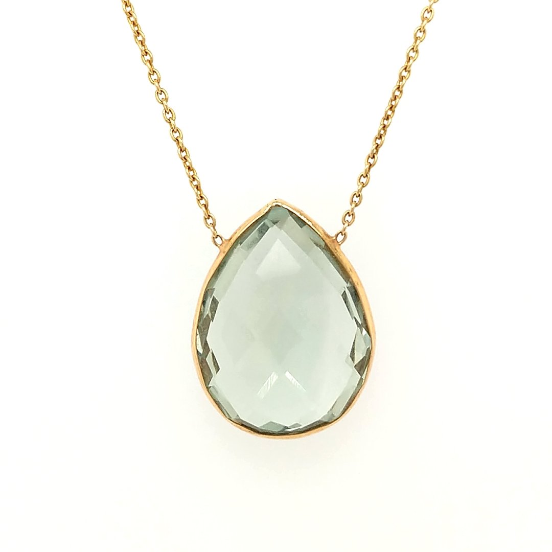 SoldA Green Amethyst PendantCrafted in 18k yellow gold featuring (1) pear shaped Green Amethyst Measuring 1" x 3/4". Size: chain is 18" Weight: 3.5dwtSee Sold Price