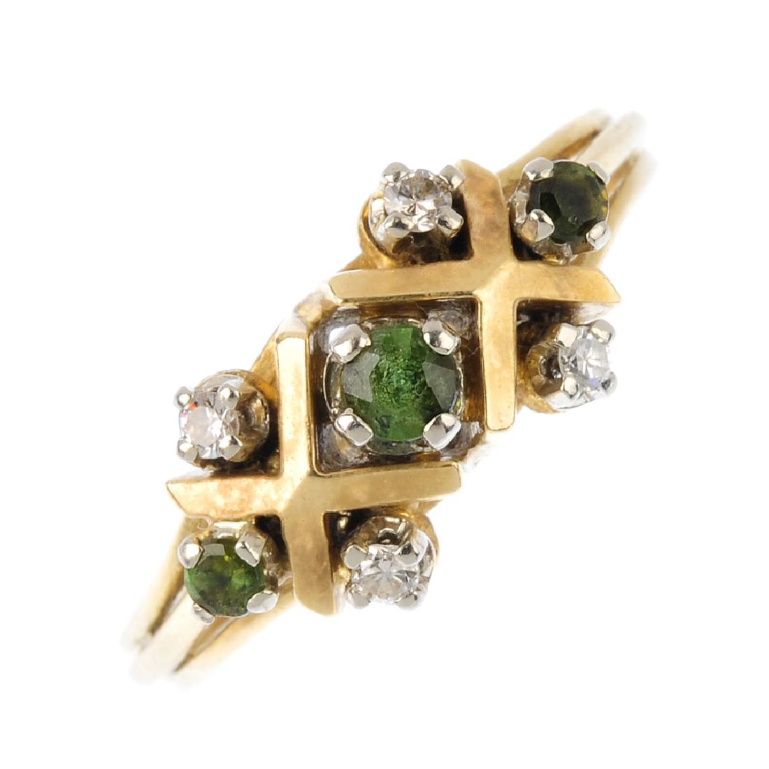 A green gem and diamond cluster ring. The