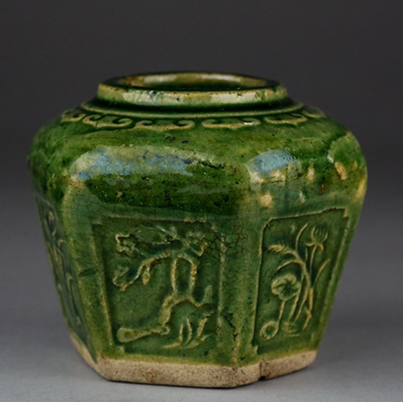 A GREEN GLAZED HEXAGONAL PORCELAIN JAR