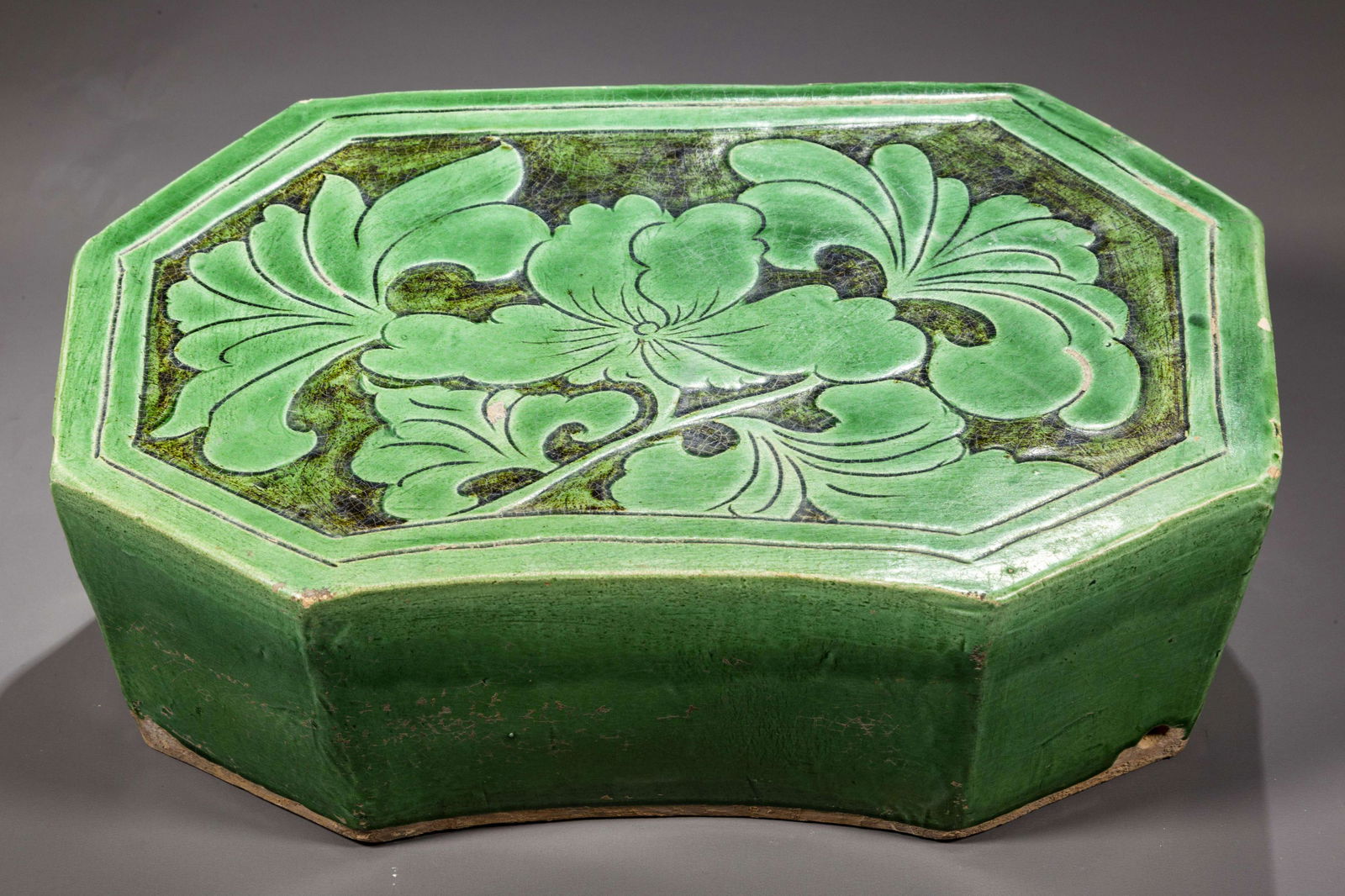 A GREEN GLAZED PORCELAIN PILLOW.