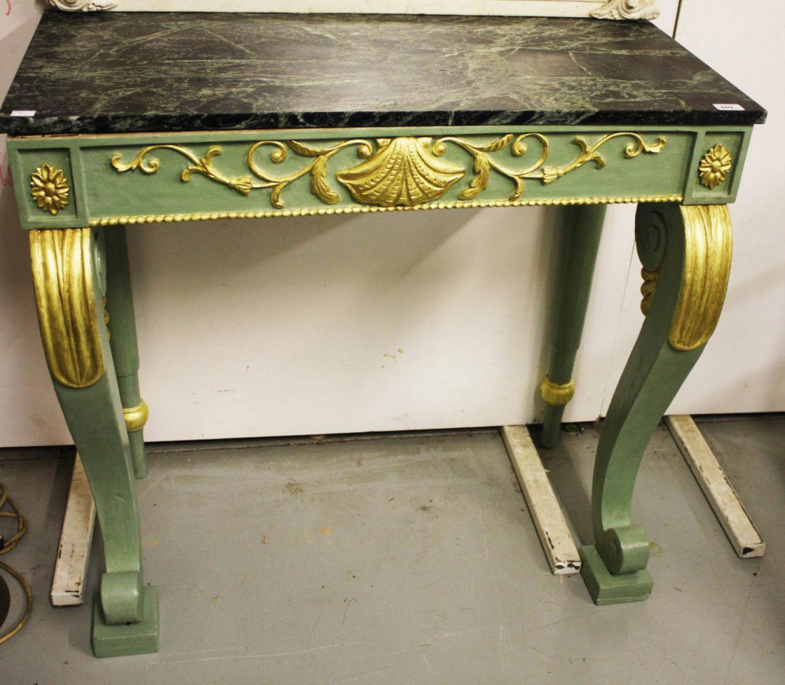 A GREEN PAINTED AND PARCEL GILT CONSOLE TABLE, with