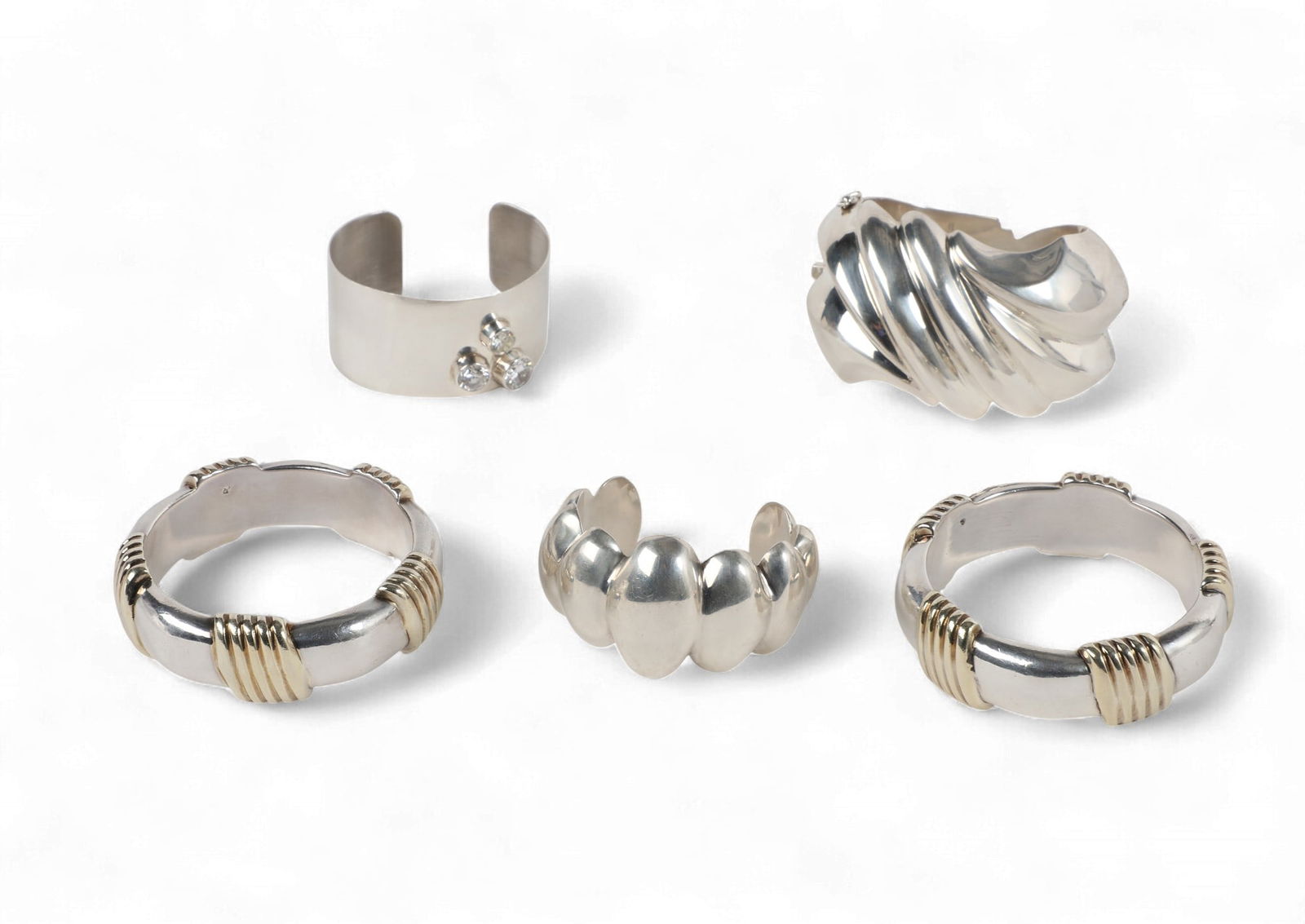 A group of five sterling silver cuffs and bangles