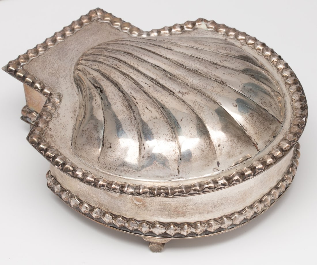 A HEAVY HANDWROUGHT STERLING SILVER SHELL-FORM BOX 33OZ