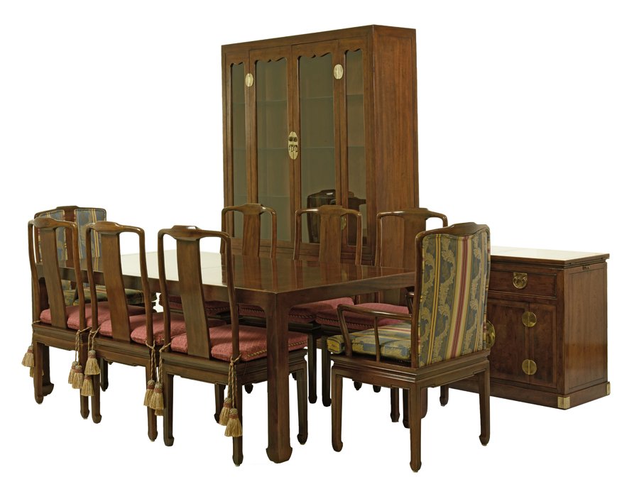 SoldCentury Chinese Style Dining Room SetCentury Furniture Co, Chinese style eleven piece dining room set, burl and ebonized woods, mid to late 20th c., signed on inner top drawer "Century Furniture of Distinction", 83 1/2" high x 69" x 16"See Sold Price