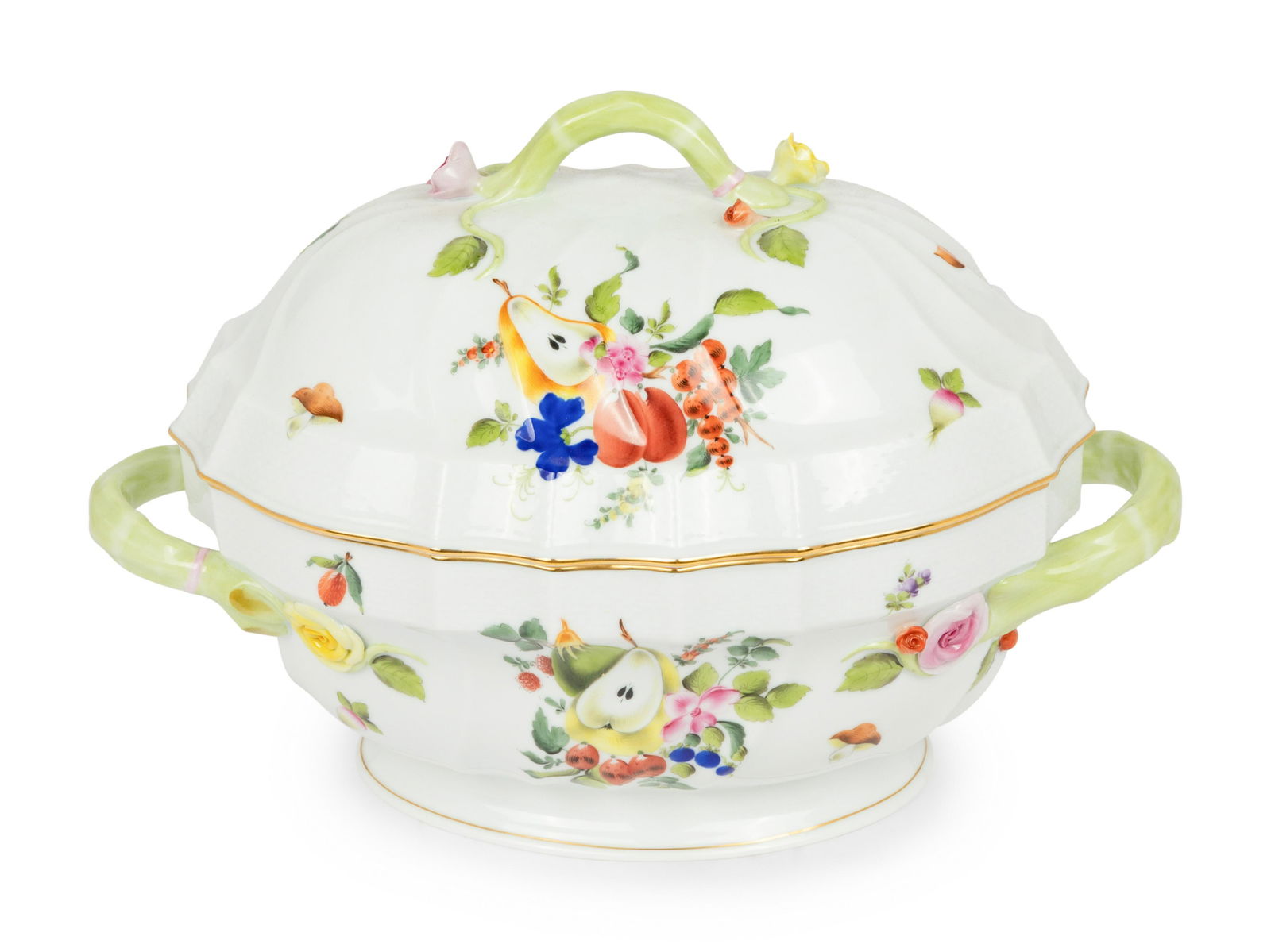 SoldLarge Herend Porcelain TureenLarge Herend Porcelain Tureen21st century, HungaryHerend porcelain tureen with carved florals and fruit motifs throughout. Gilt accents and two handles. Marked on bottom "22-2-66/CD G2002" aSee Sold Price