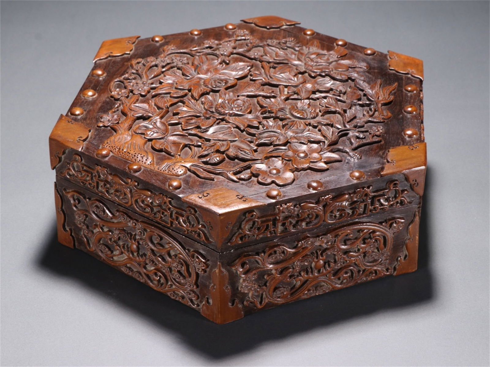 A hexagonal box with evening pear wood carving and dragon pattern