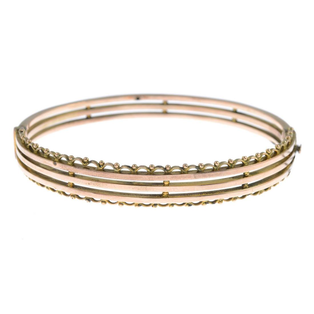 A hinged bangle, with scalloped border.Stamped 9ct.