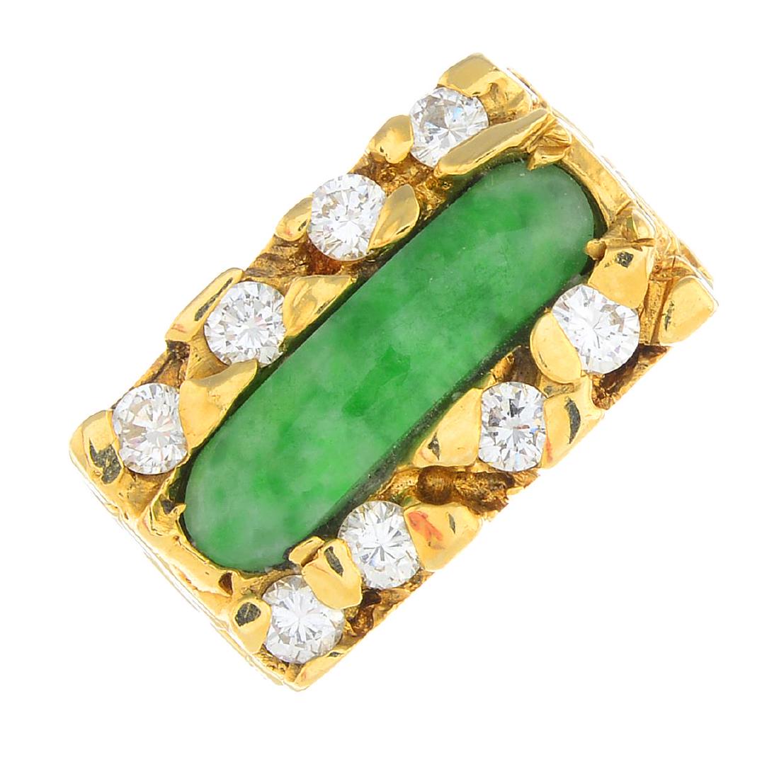 A jade and diamond ring. The curved rectangular jadeite
