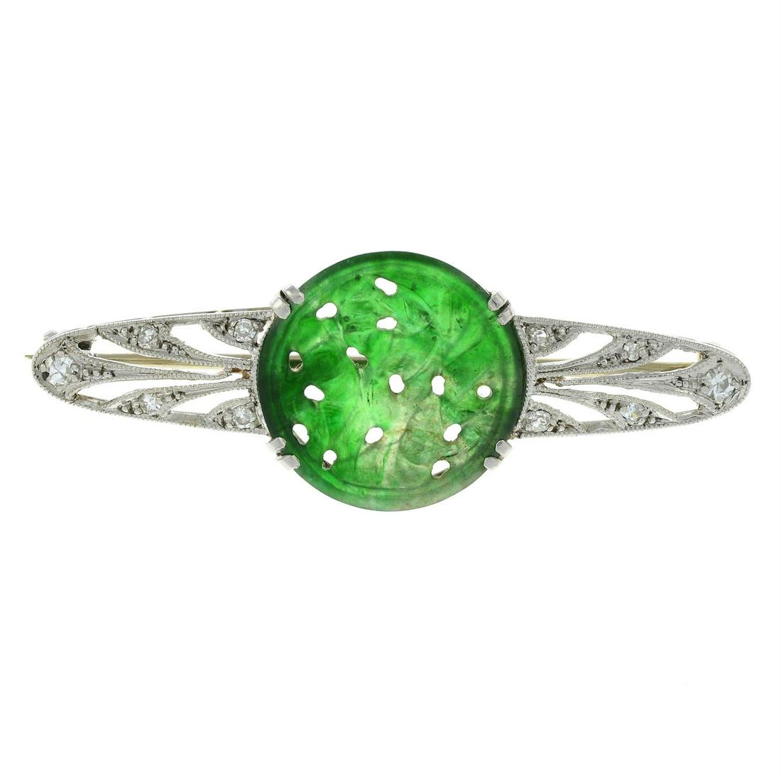 A jade and single-cut diamond brooch.