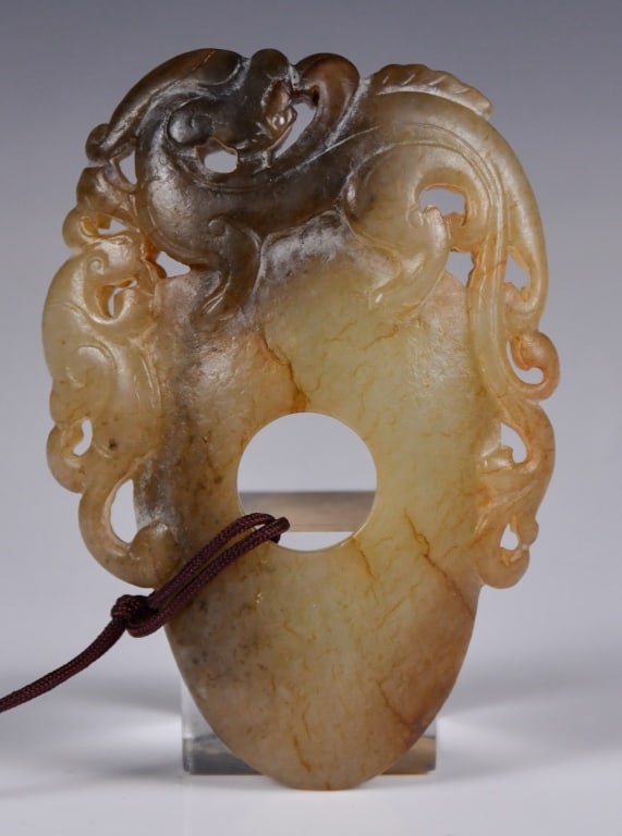 SoldA Jade Carved Dragon Plaque, QingReticulated carved in the shape of a curling dragon, worked from a cream jade stone with black inclusions. L:5.8cm 清 老提油龍紋珮See Sold Price