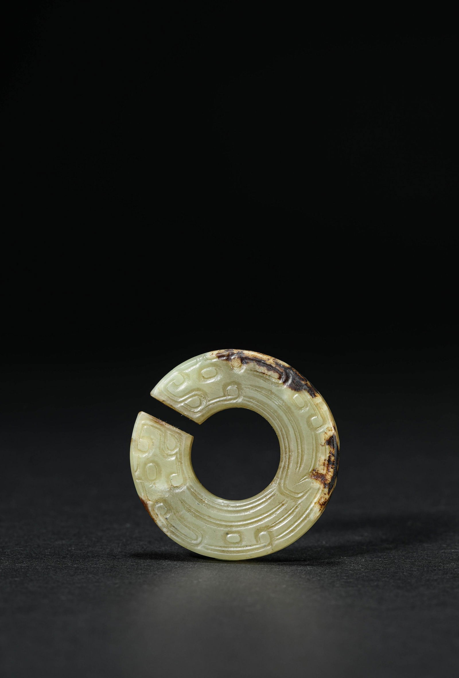 SoldWHITE JADE CARVED PENDANTThe jade carved pendant is of flattened form, the surface incised with archaic patterns surrounding the center hole, the jade is of white color tone with russet on the edges. Length: 3 1/8 in (7.9 cm)See Sold Price