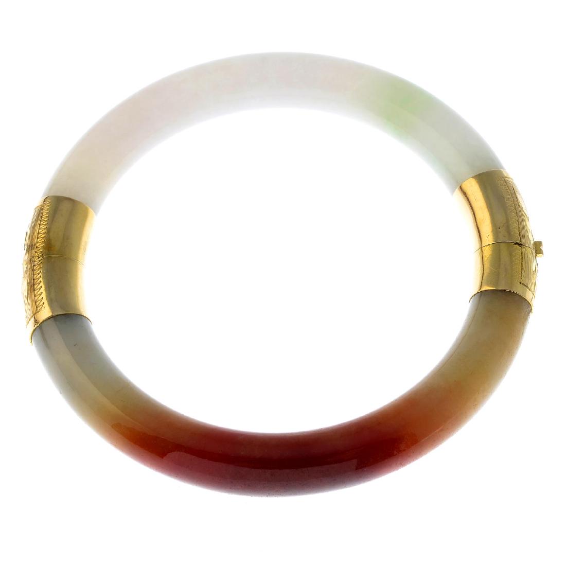 SoldA hinged jade bangle. Designed as two semi-circularA hinged jade bangle. Designed as two semi-circular jade pieces, gold-tone hinge engraved with leaves and a similarly designed push-piece clasp with safety chain. Jade untested. Marks indicating gold.See Sold Price