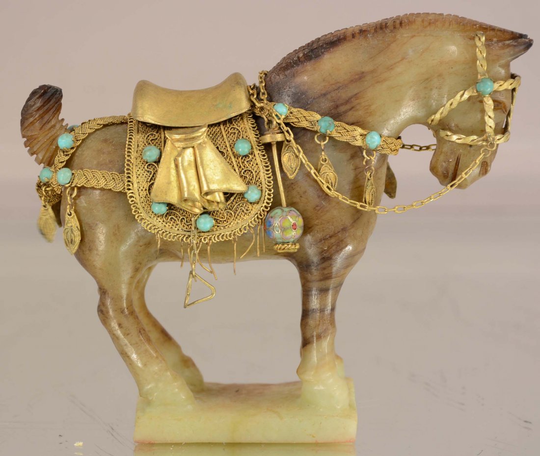 SoldChinese Jade Horse with turquoise jewelsChinese Jade Horse with turquoise jewels. 41/2”t. Ca. 1900.See Sold Price