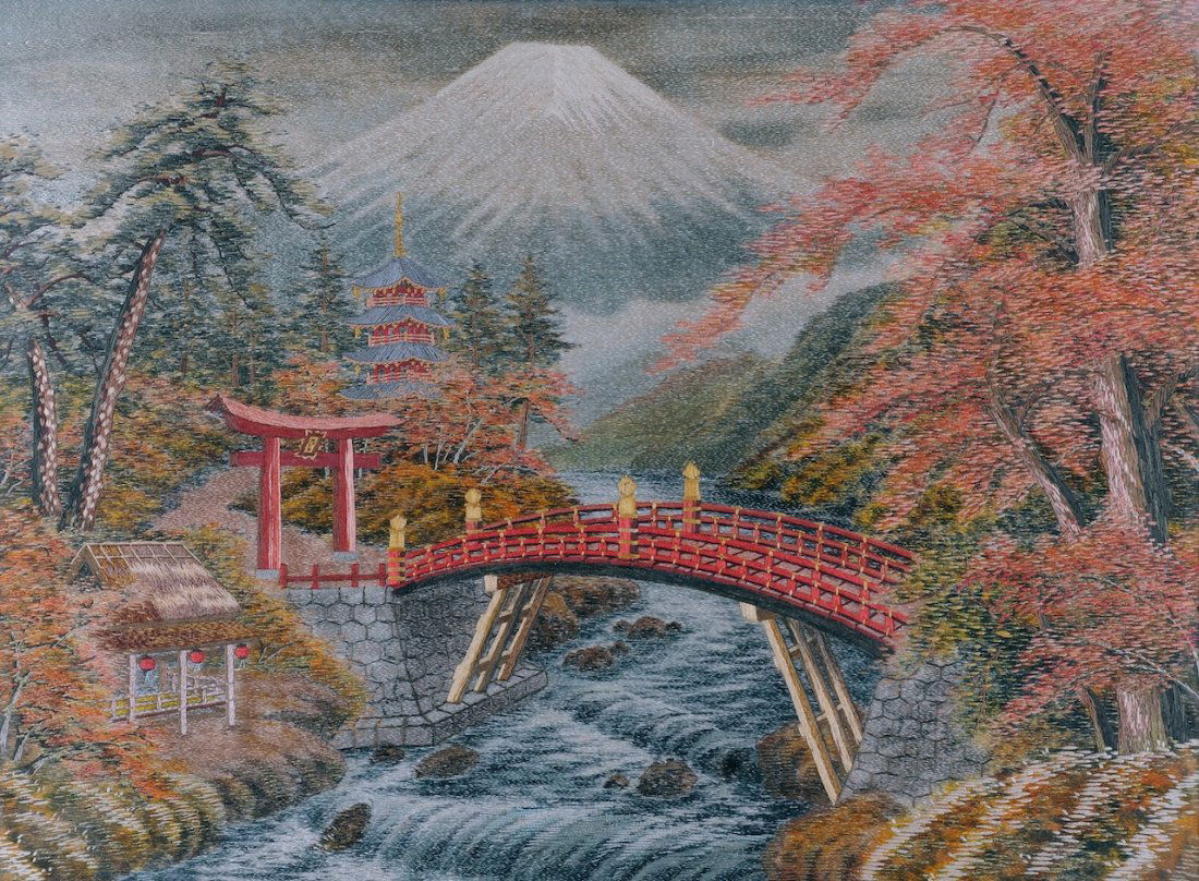 A JAPANESE POLYCHROME SILK AND WOOL THREAD NEEDLEPOINT,