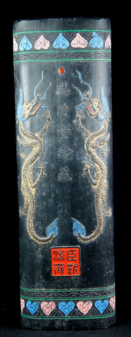 A KANGXI MARK COLOUR INKSTONE WITH DRAGON PATTERN