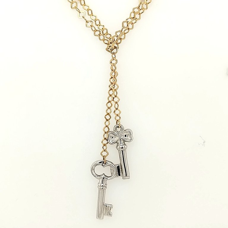 SoldSTERLING SILVER TIFFANY & CO. KEY NECKLACESTERLING SILVER TIFFANY & CO. KEY NECKLACE ~ 18" TIFFANY & CO. BAR LINK CHAIN W/ TWO KEY PENDANTS 2.25" OPENWORK HEART KEY PENDANT W/ TIFFANY BLUE INLAY & 1.5" OPENWORK FLORAL KEY W/ DIAMOND ACCENT (0See Sold Price