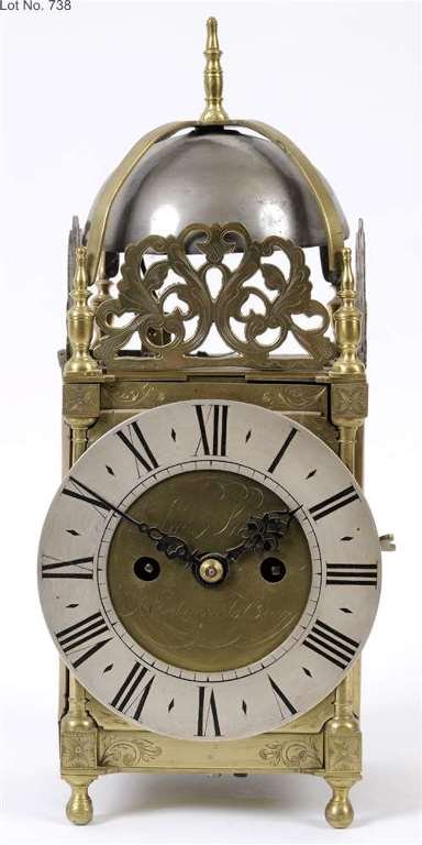 A lantern clock, the brass dial having a silvered