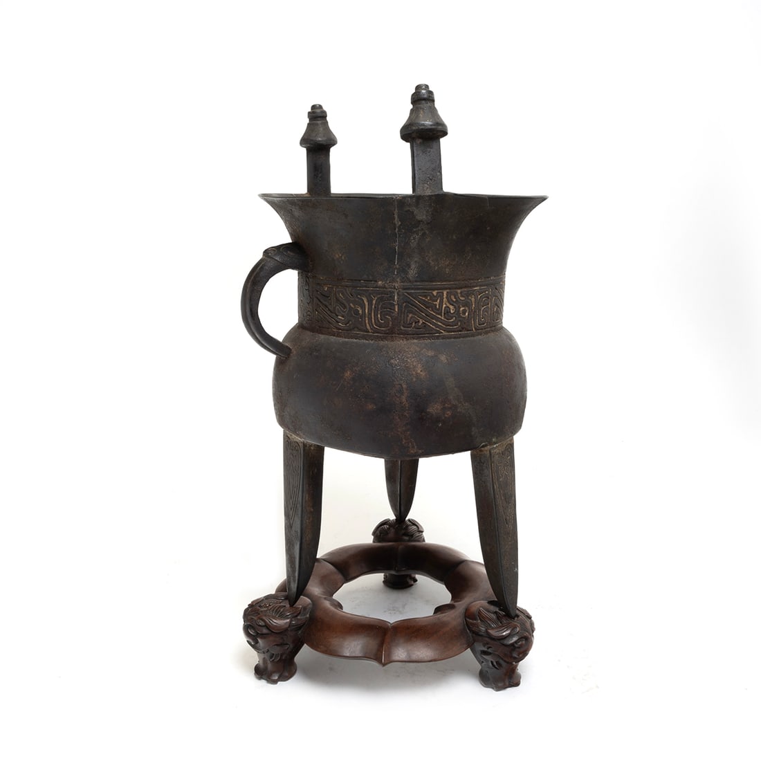 A Large Archaistic Bronze Libation Jue Cup on Base