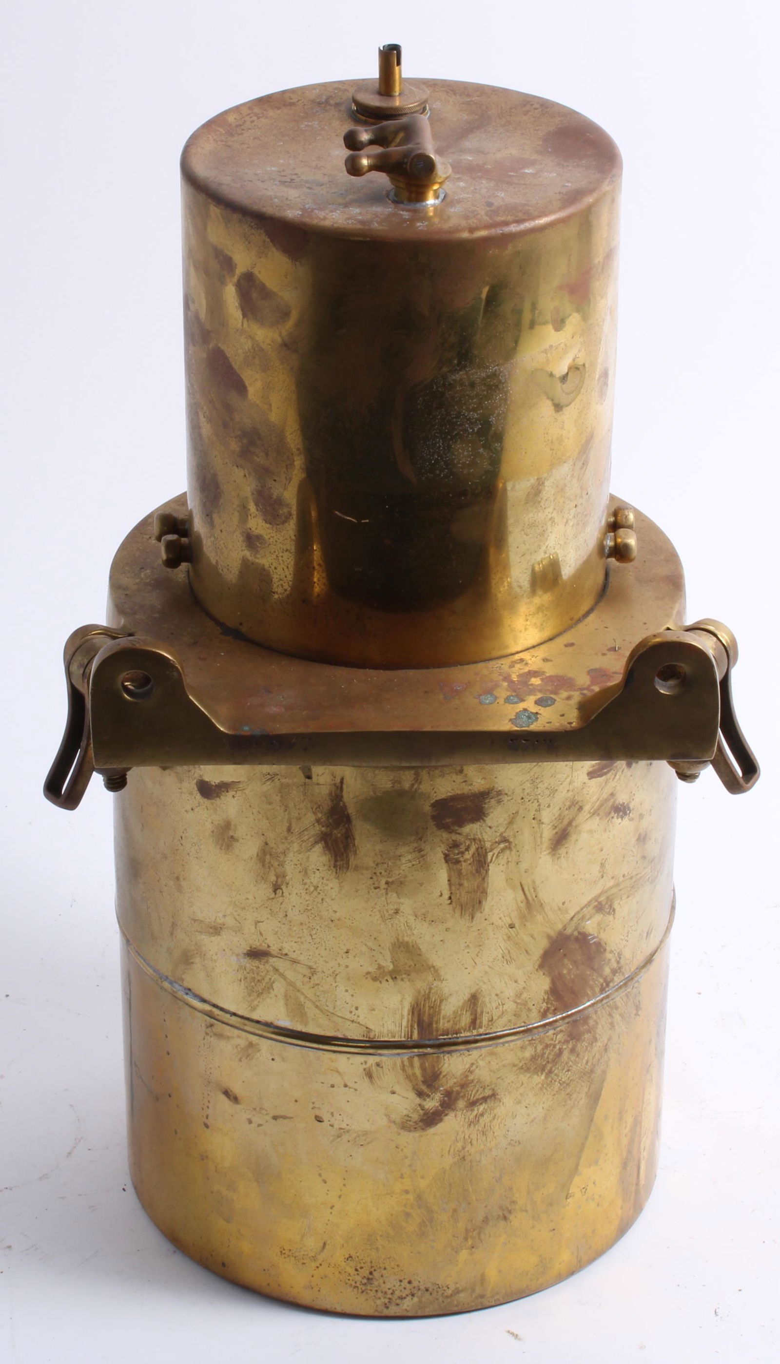 A large brass upright cylindrical acetylene generator,