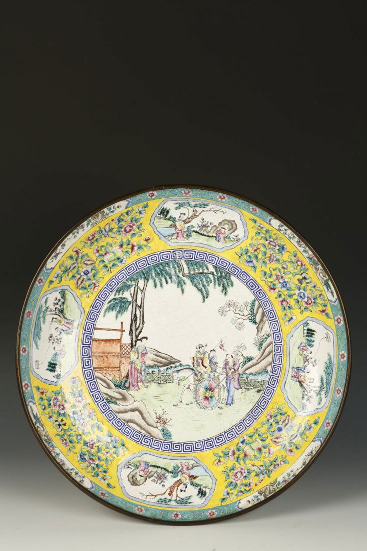 A LARGE CANTONESE ENAMELLED DISH, the centre decorated