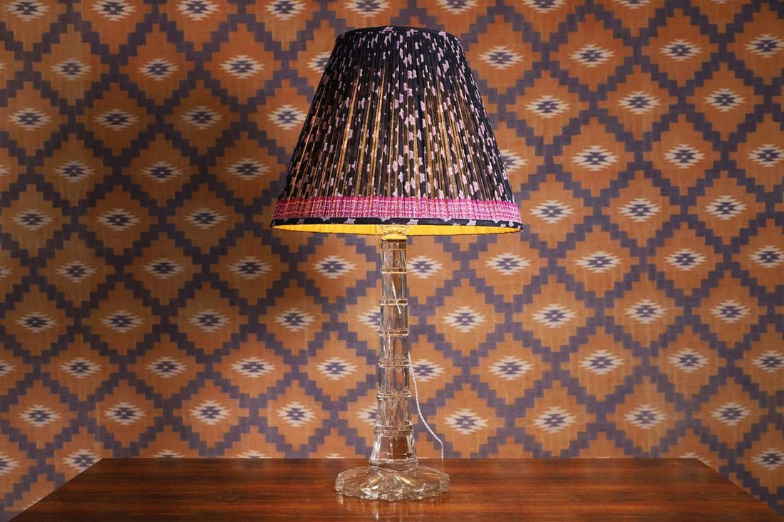 SoldLARGE GLASS TABLE LAMPHAND BLOWN TABLE LAMP, WITH LARGE FABRIC SHADE, MARBRO, 48" H. . THIS ITEM EXCEEDS SIZE LIMITATIONS FOR IN HOUSE SHIPPING, MUST BE PICKED UP IN HOUSE OR SHIPPED VIA 3rd PARTY GROUND SHIPPER.See Sold Price