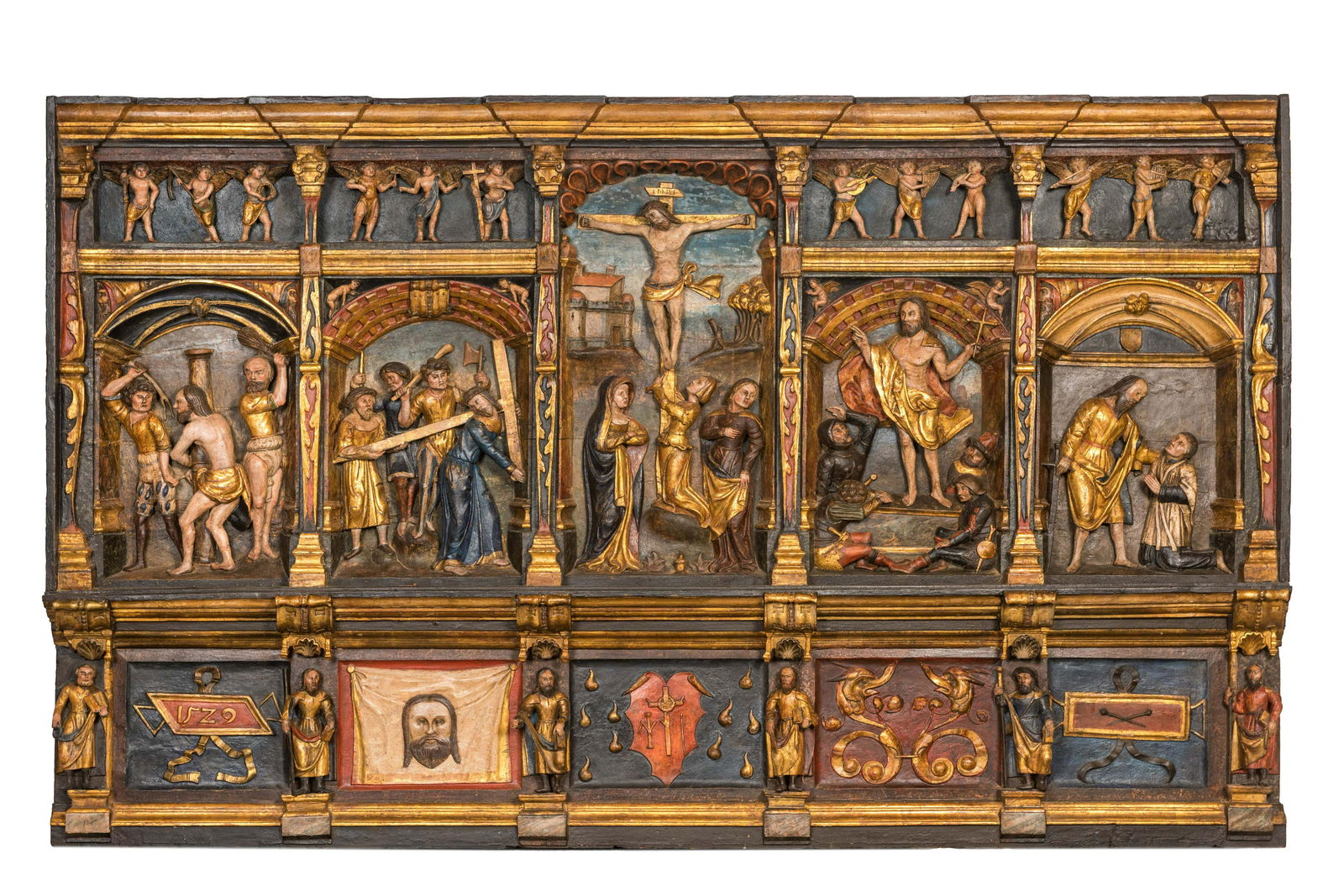 A large Flemish polychrome walnut retable, probably Ghent, dated 1529