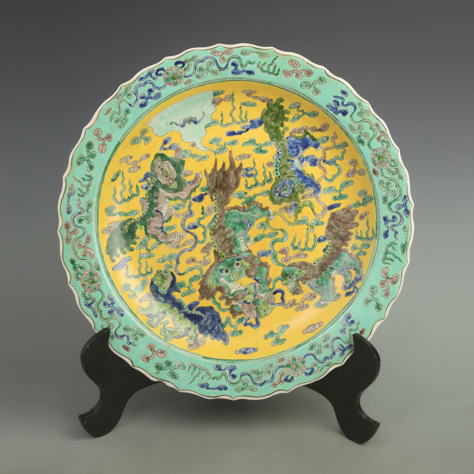 A LARGE SANCAI GLAZED LION PATTERN PORCELAIN PLATE