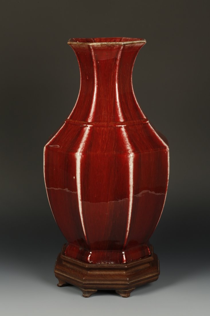 A LARGE SANG DE BOEUF OCTAGONAL VASE, the thick