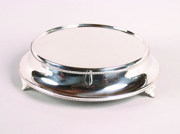 SoldLarge Antique Silverplate Wedding Cake StandA silver plate cake stand or plateau of exceptional size, circa 1900, measuring 8" x 24 1/2", with an 18" top surface diameter. Four red oak ball feet, mirrored top supported by an oak under-mounted pSee Sold Price