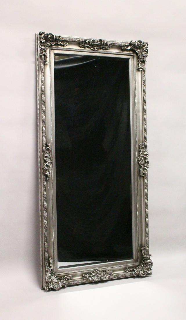 A LARGE WALL MIRROR, with moulded silver coloured